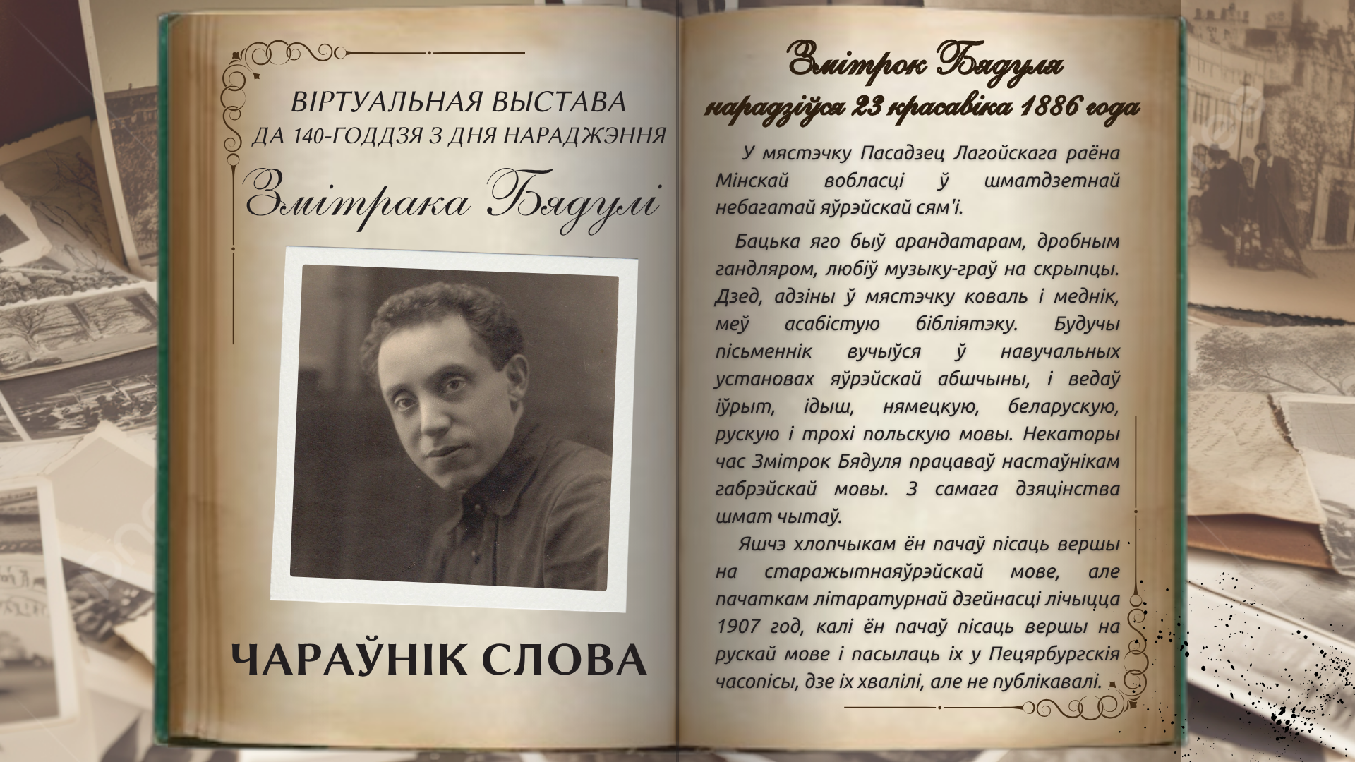 К 140-летию со дня рождения Змитрока Бядули сотрудники ГУК «Хойникская центральная районная библиотека» подготовили виртуальную выставку «Чараўнік слова». В выставке подобраны произведения Змитрока Бядули,одного из выдающихся начинателей новейшей белорусской литературы, которые позволят вам познакомиться с разными гранями его творчества.Так же, данная выставка знакомит с краткой биографией писателя